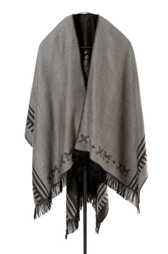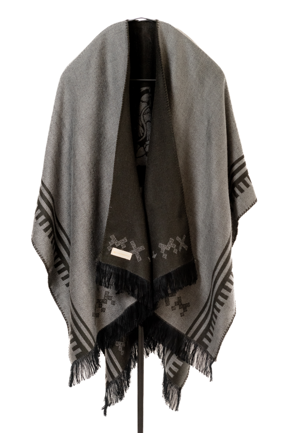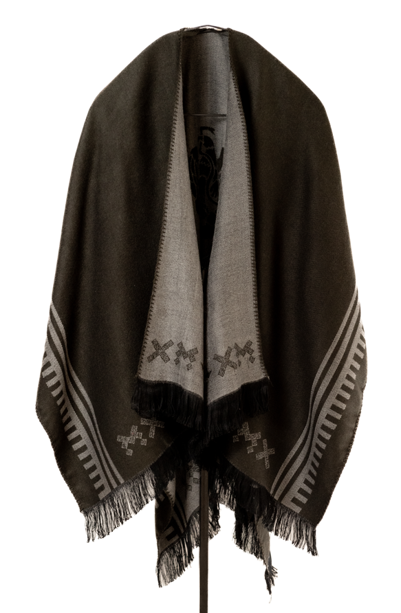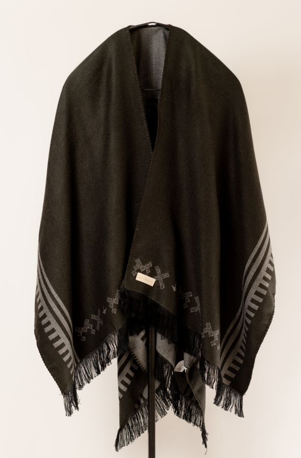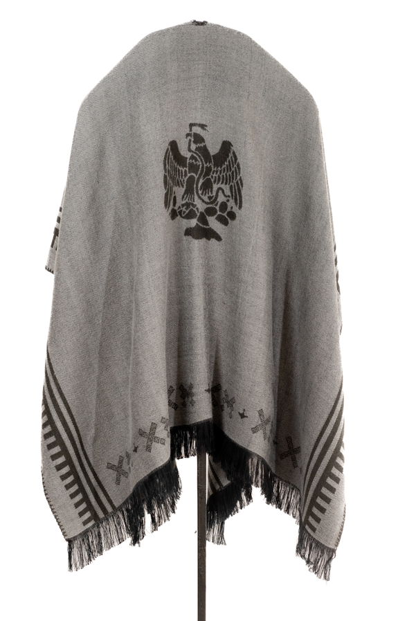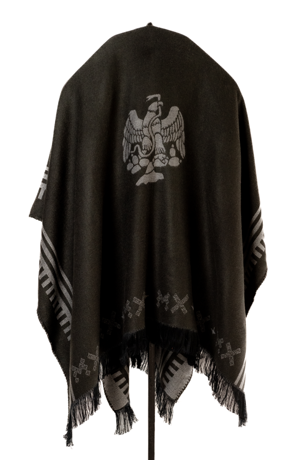 El diseño hace referencia al águila que se utlizó durante el periodo de mandato del Gral. Porfirio Díaz. Esta capa cuenta con dos vistas y abertura por la parte de enfrente, la caída va alrededor de los hombros, adapatándonse a su silueta. Se acondiciona tanto a hombres como mujeres dando versatilidad a su estilo. La textura suave y agradable al tacto del acrílico garantiza una experiencia cómoda.
